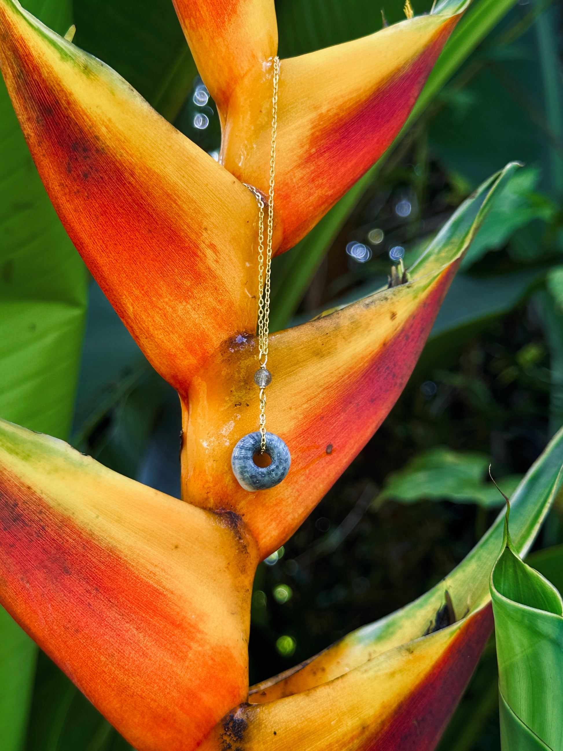 Money bead pendant made from beach combed Mariånas blue coral. Comes standard on an 18k gold plated chain with a one year warranty against tarnishing.