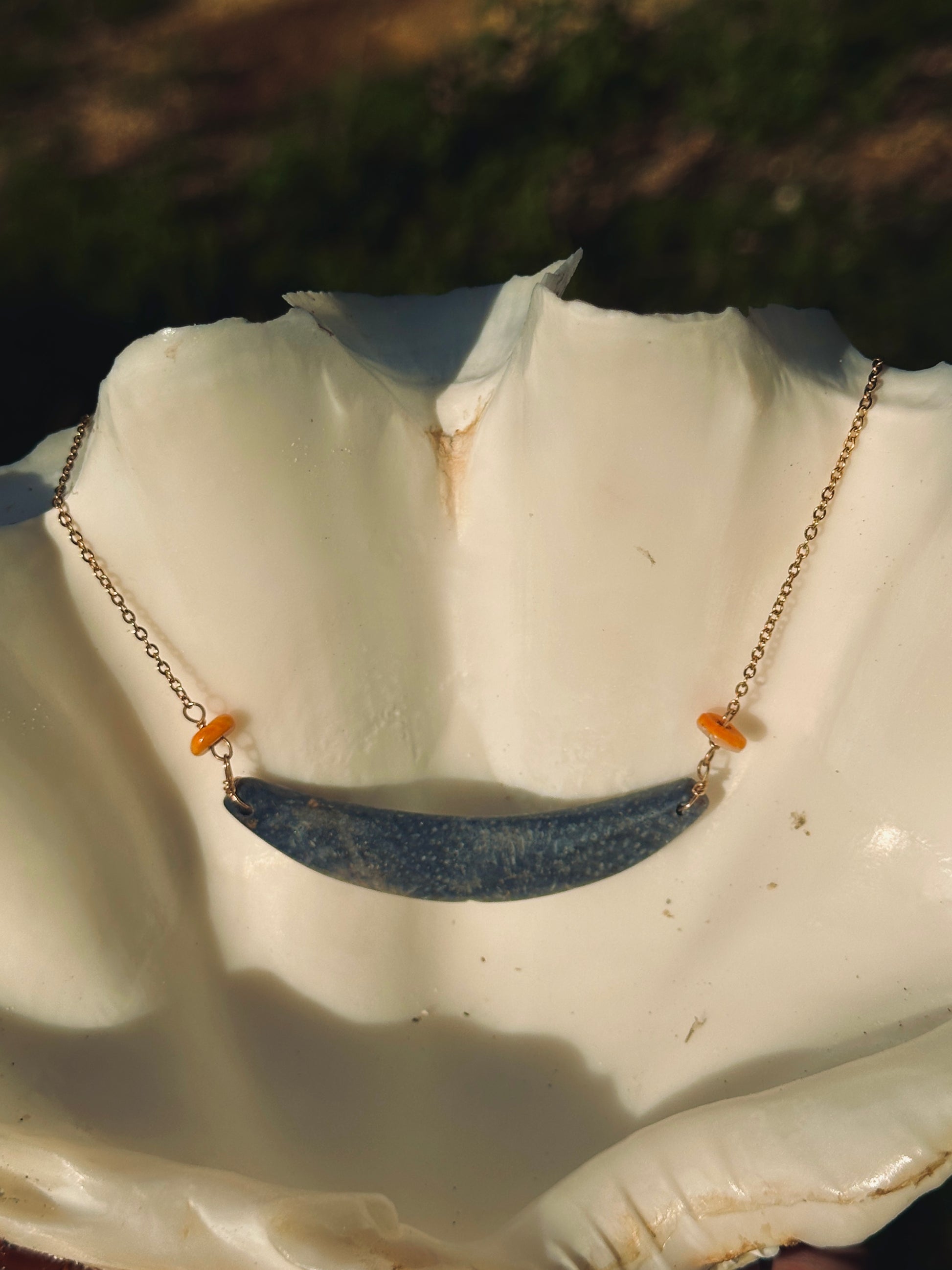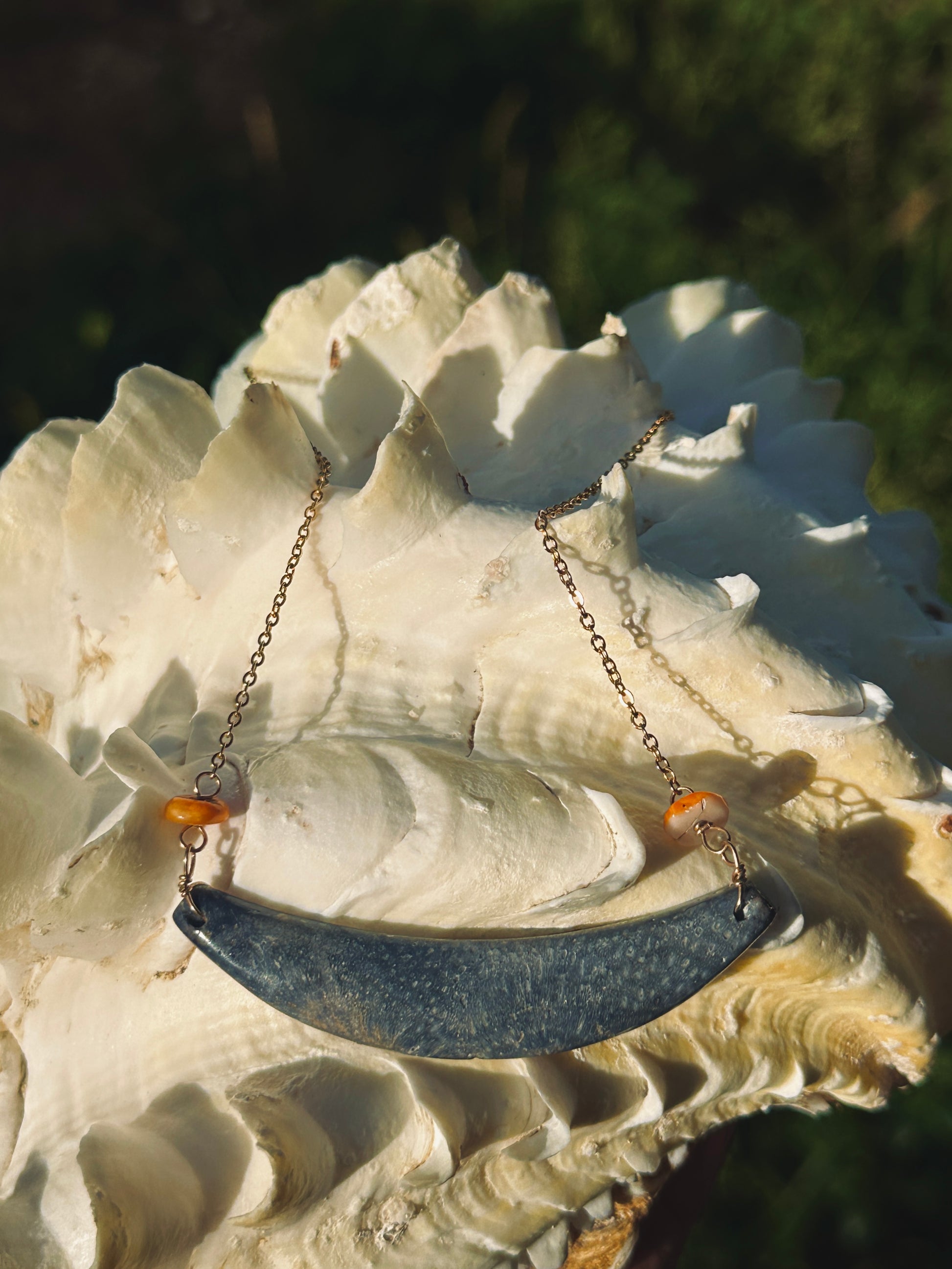 Sinåhi shaped pendant made from beach combed Mariånas blue coral accented with two petite handmade Mariånas spondy side beads. Comes standard on an 18k gold plated chain.