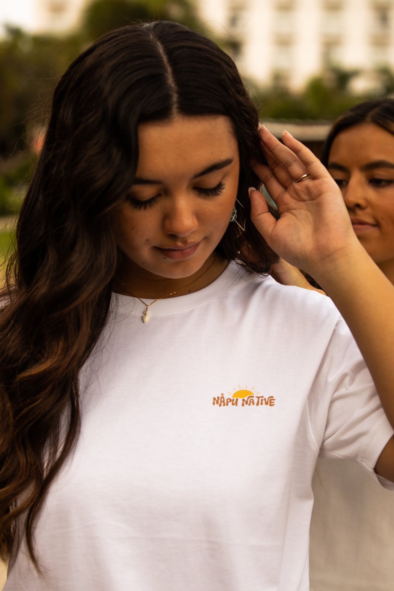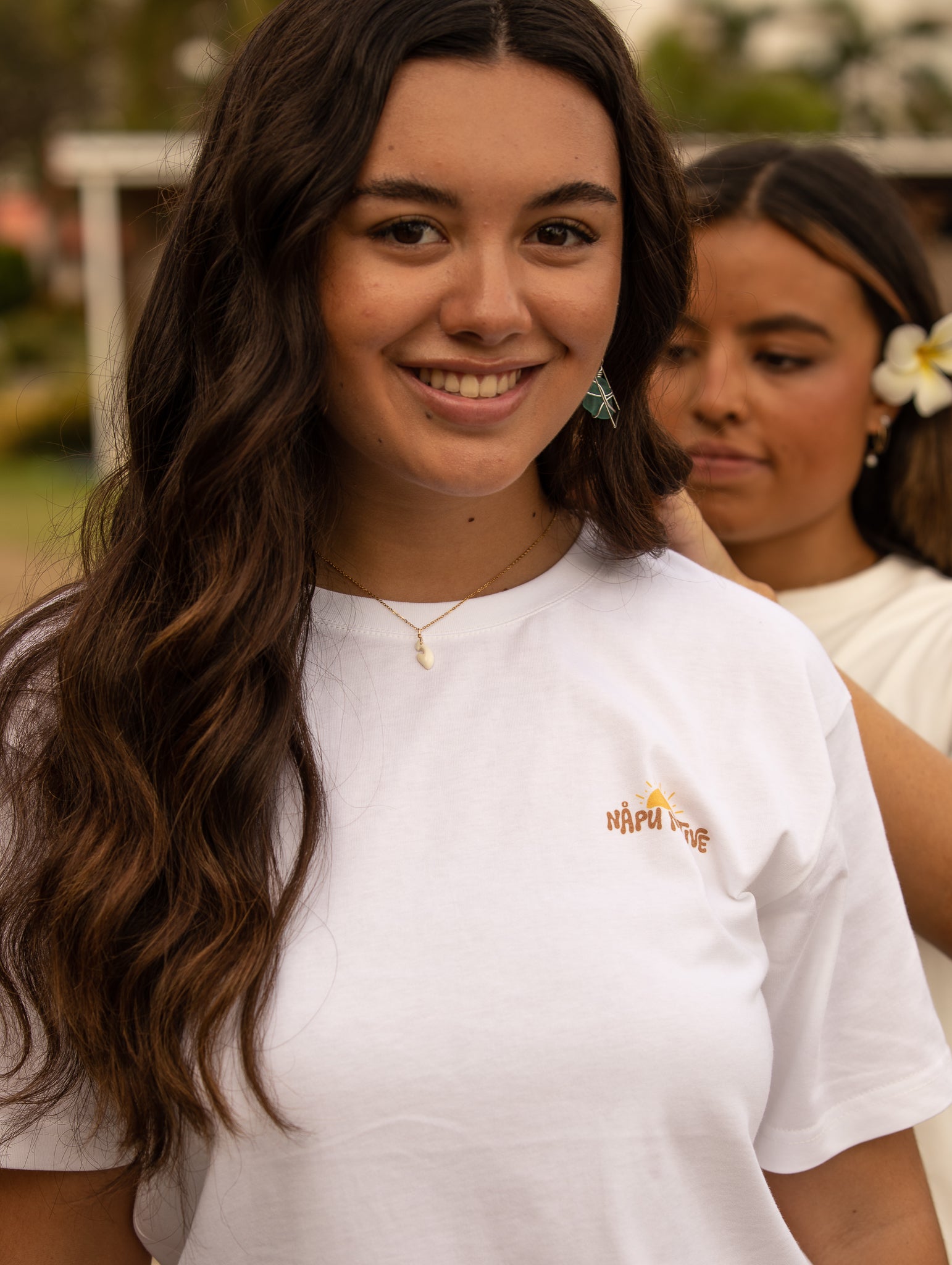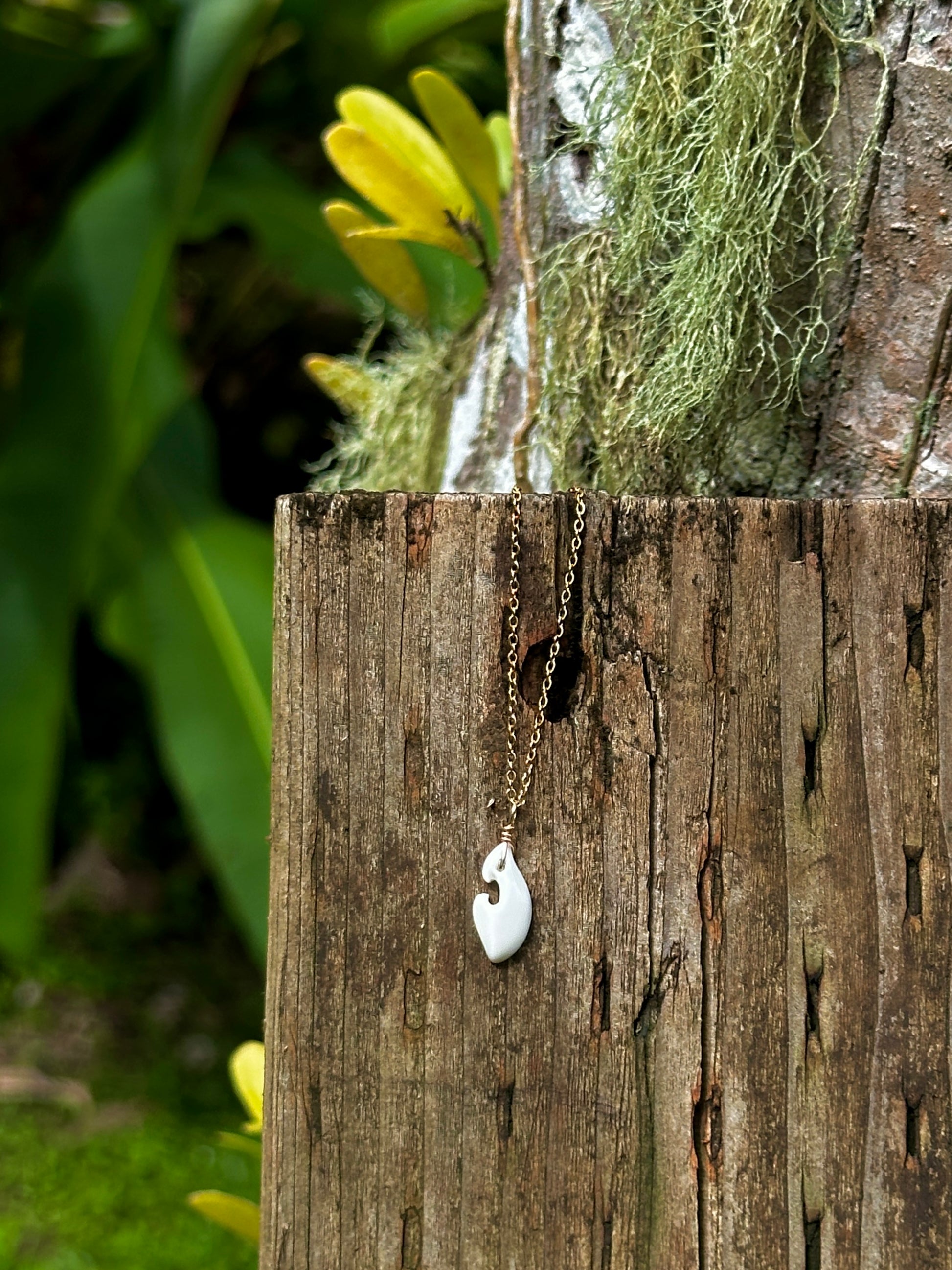 Dainty Napu hook shaped pendant handmade from Mariånas giant clam. Comes standard on an 18k gold plated chain.