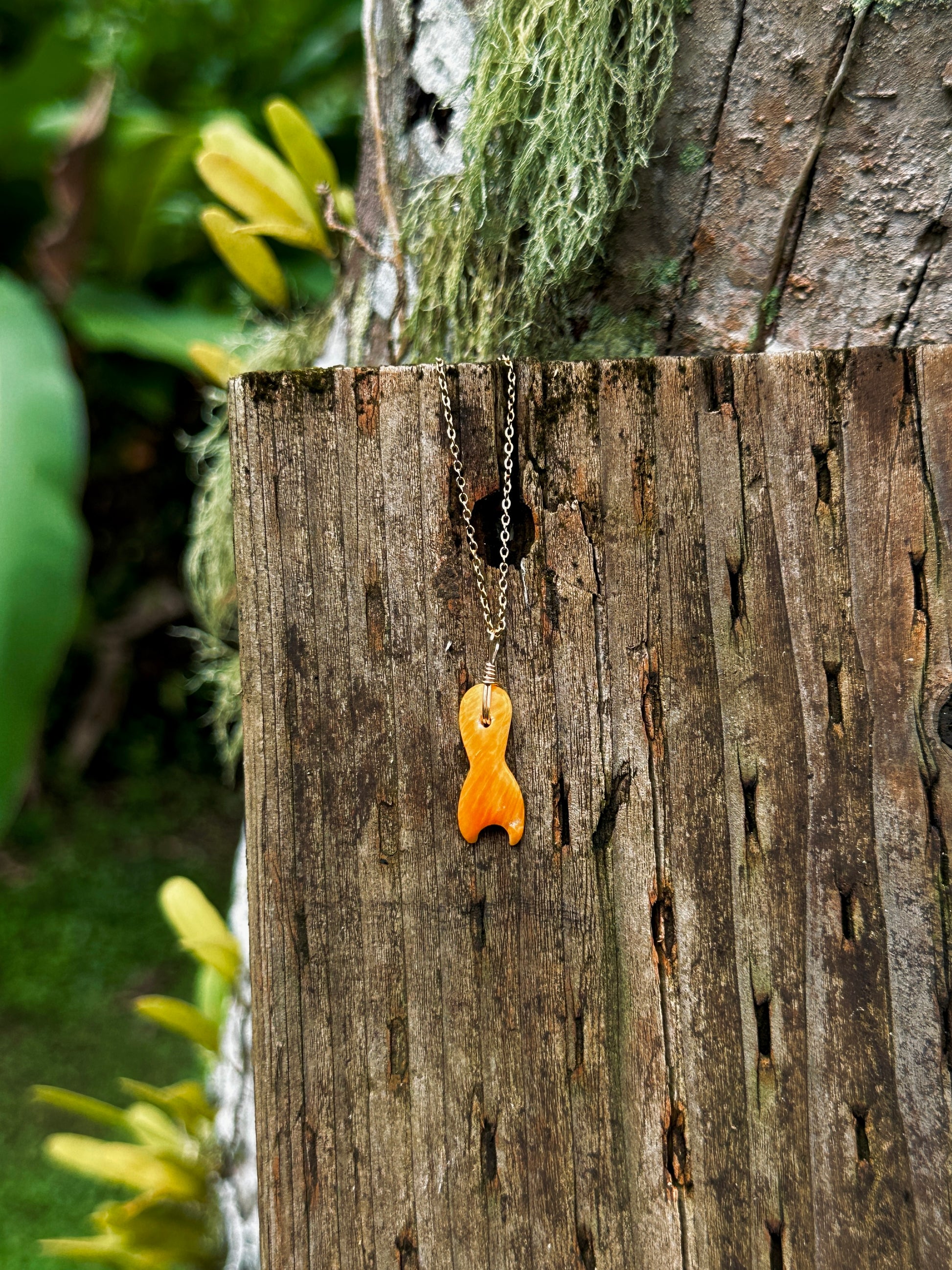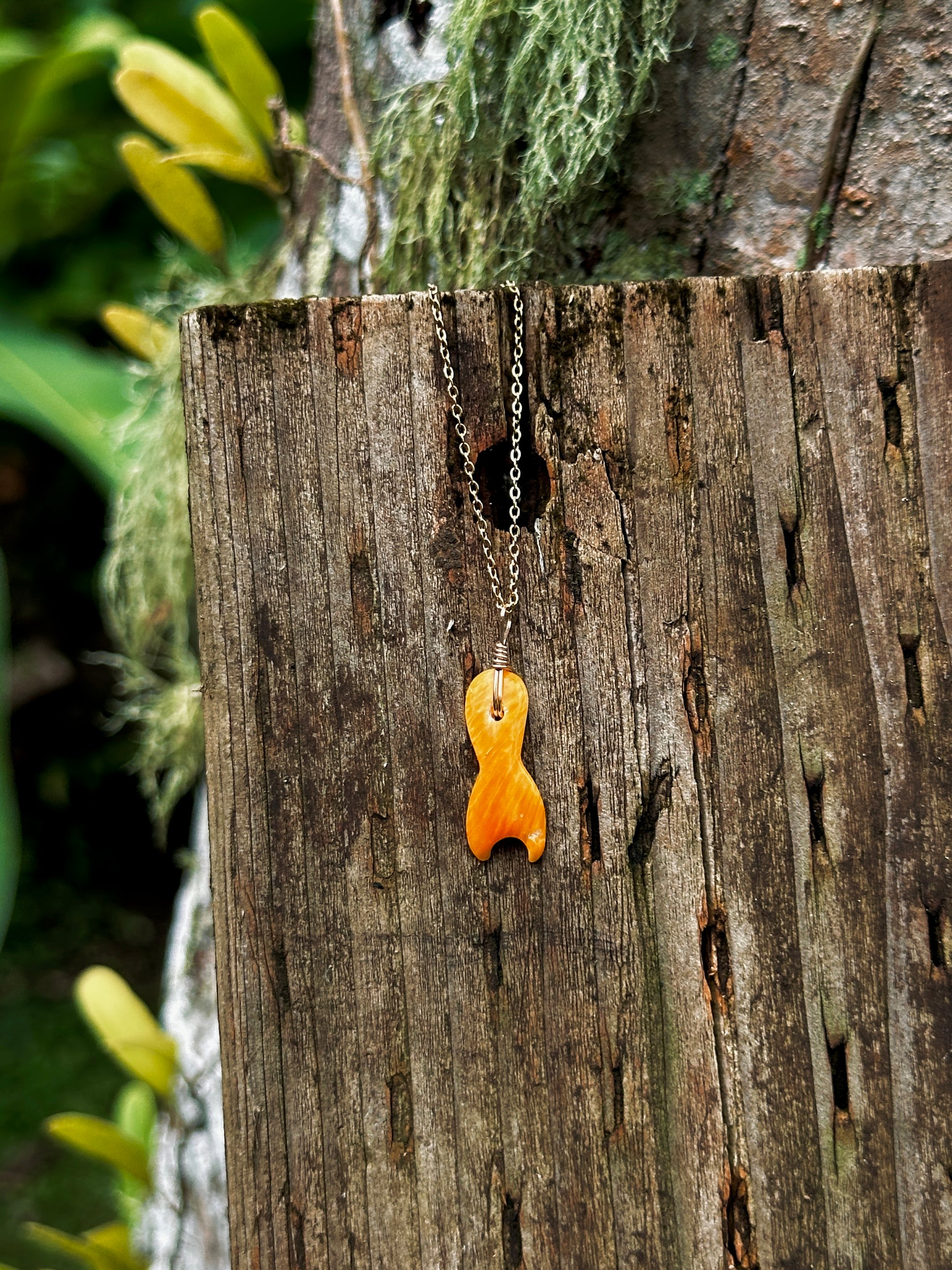 Dainty mermaid tail shaped pendant made from Mariånas spondy. Comes standard on an 18k gold plated chain.