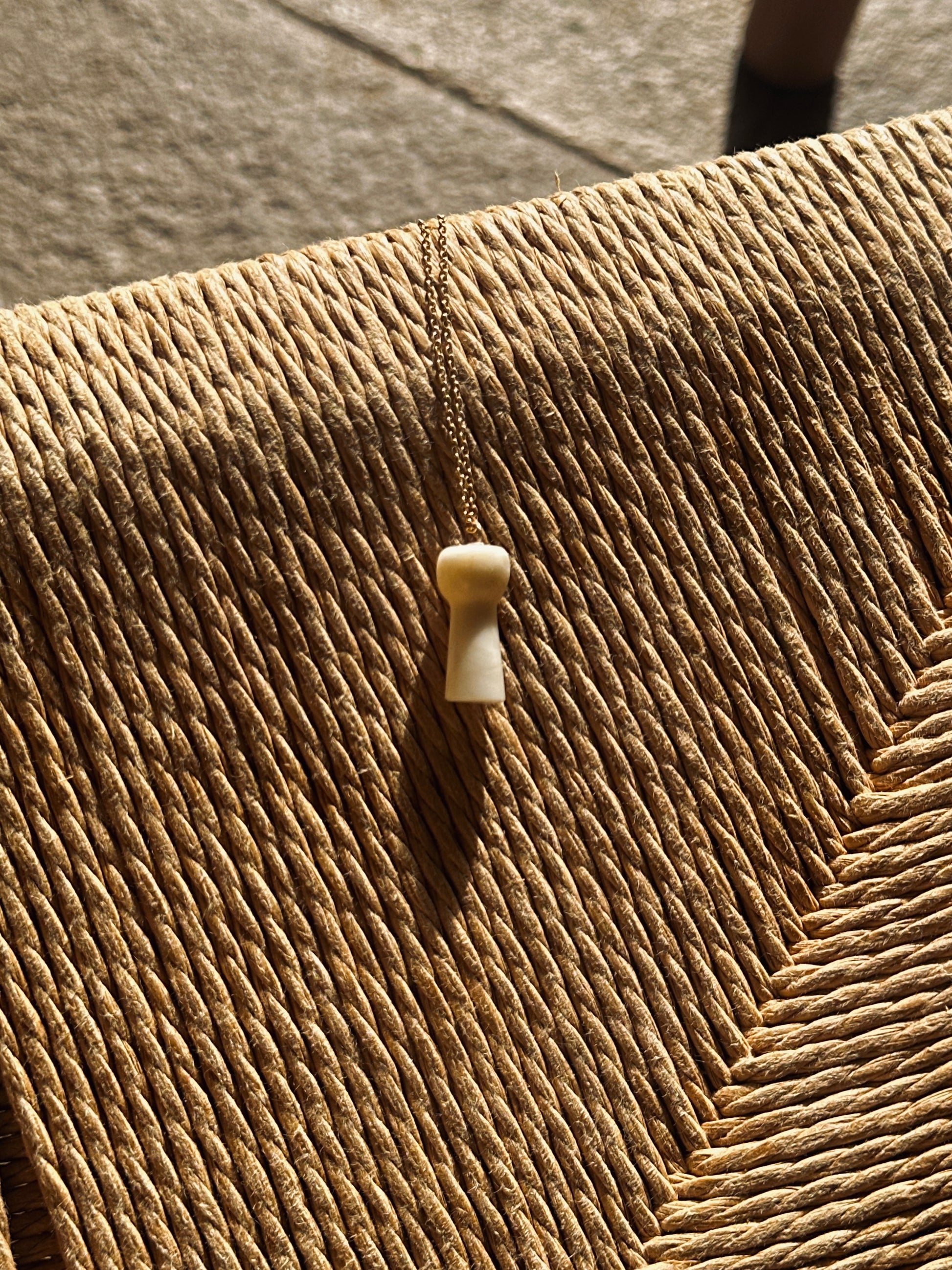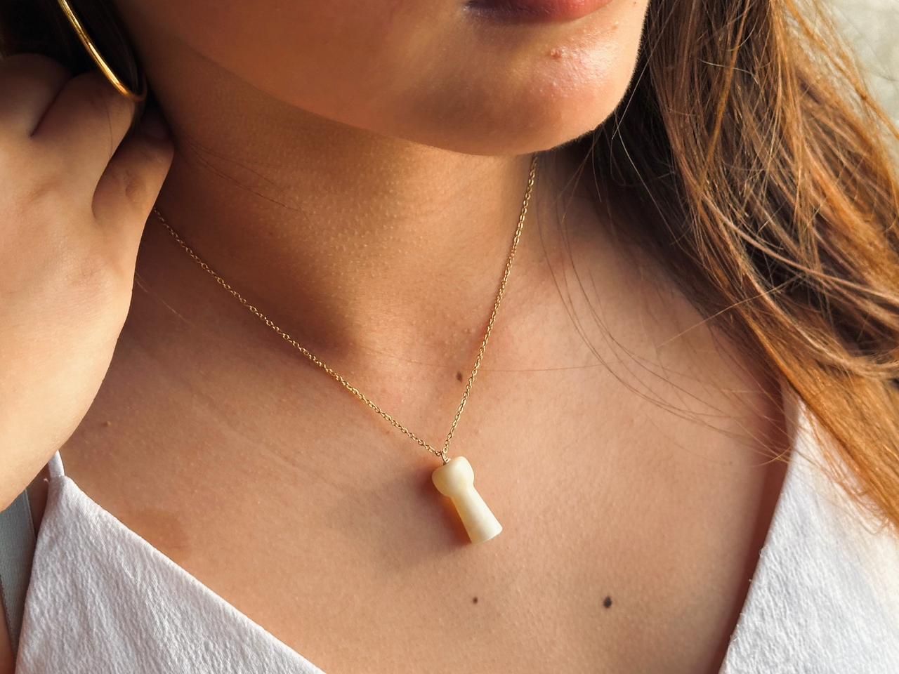 Dainty latte stone shaped pendant handmade from Mariånas giant clam. Comes standard on a safe for ocean use 18k gold plated chain.