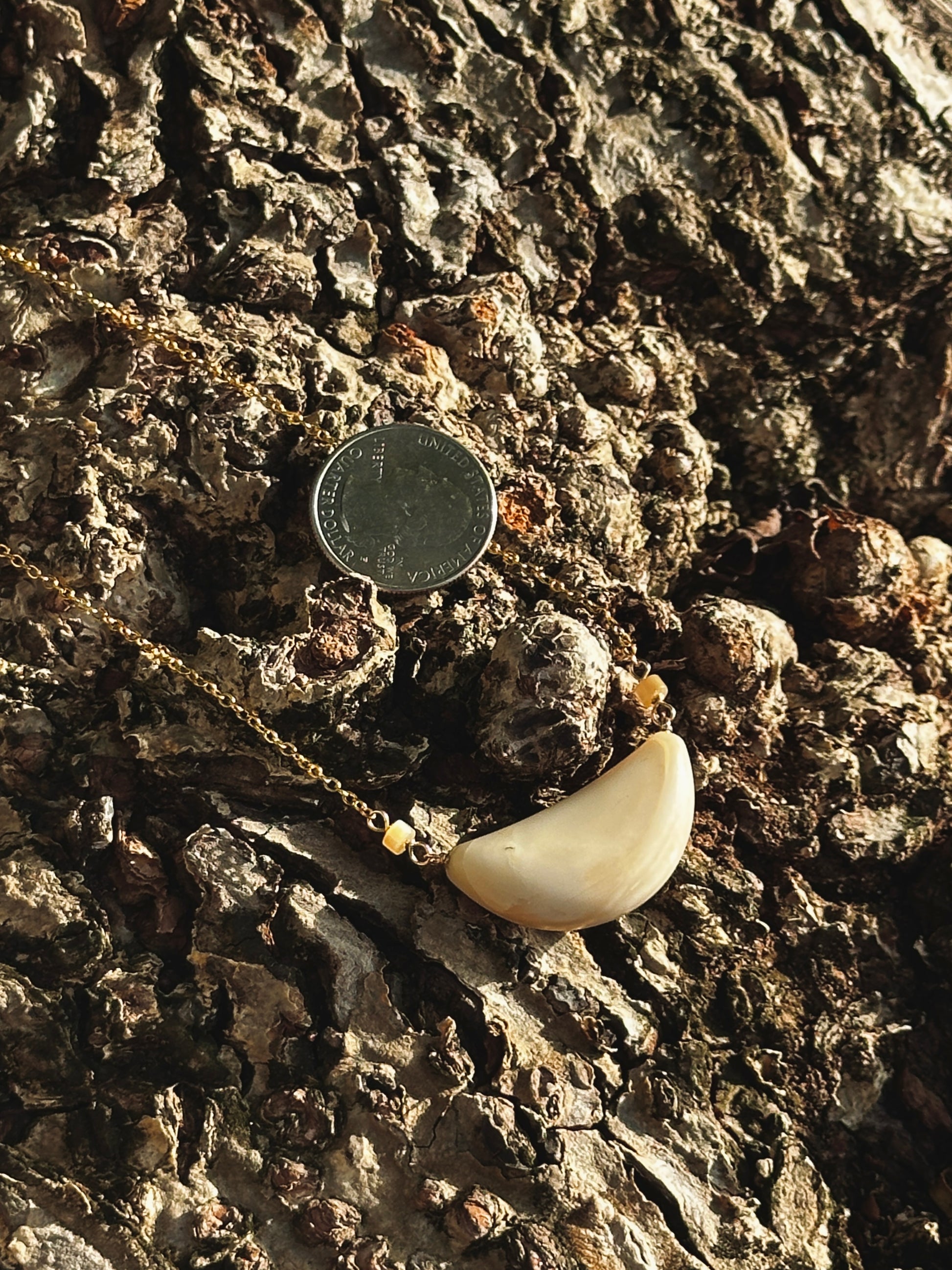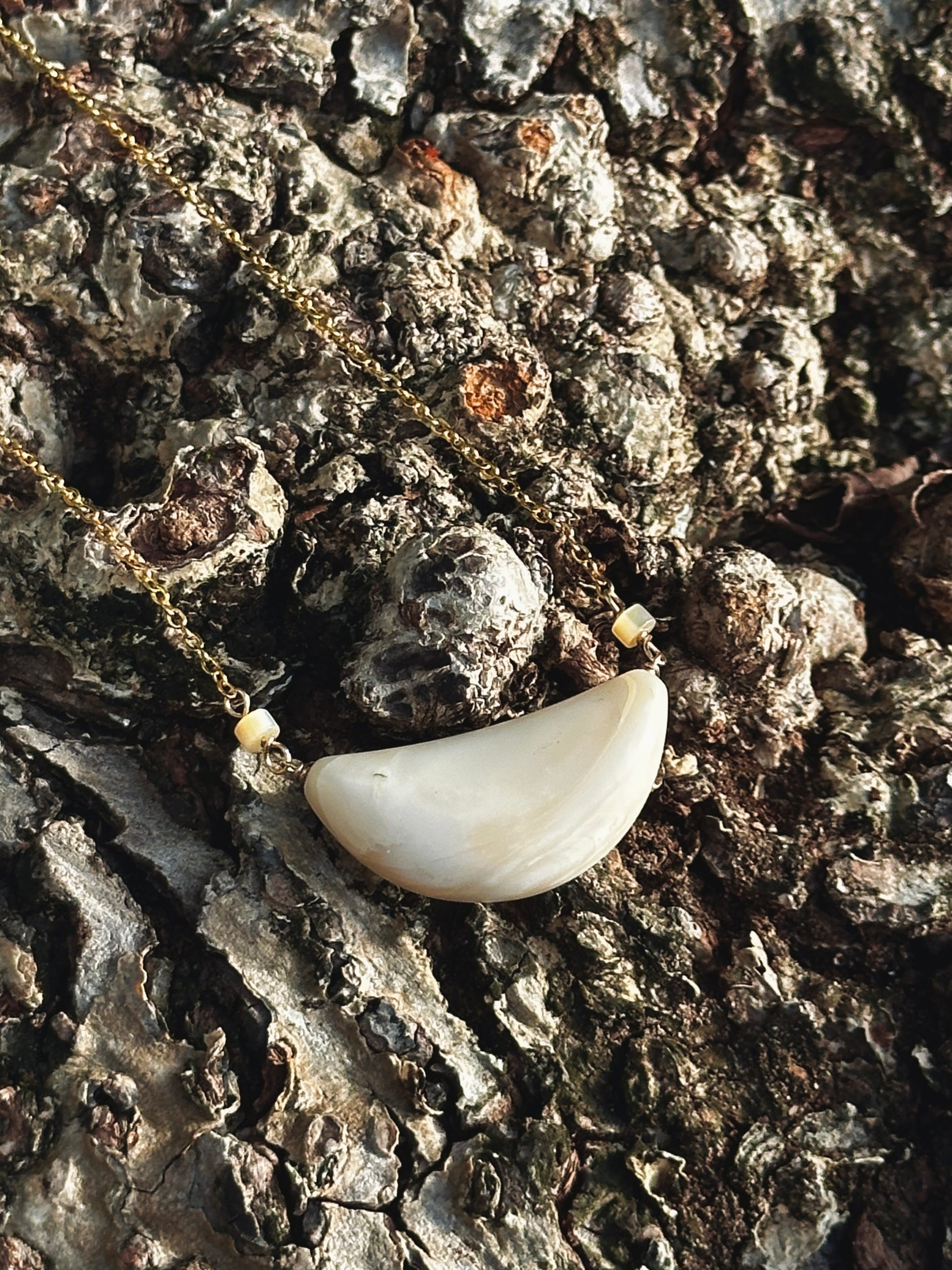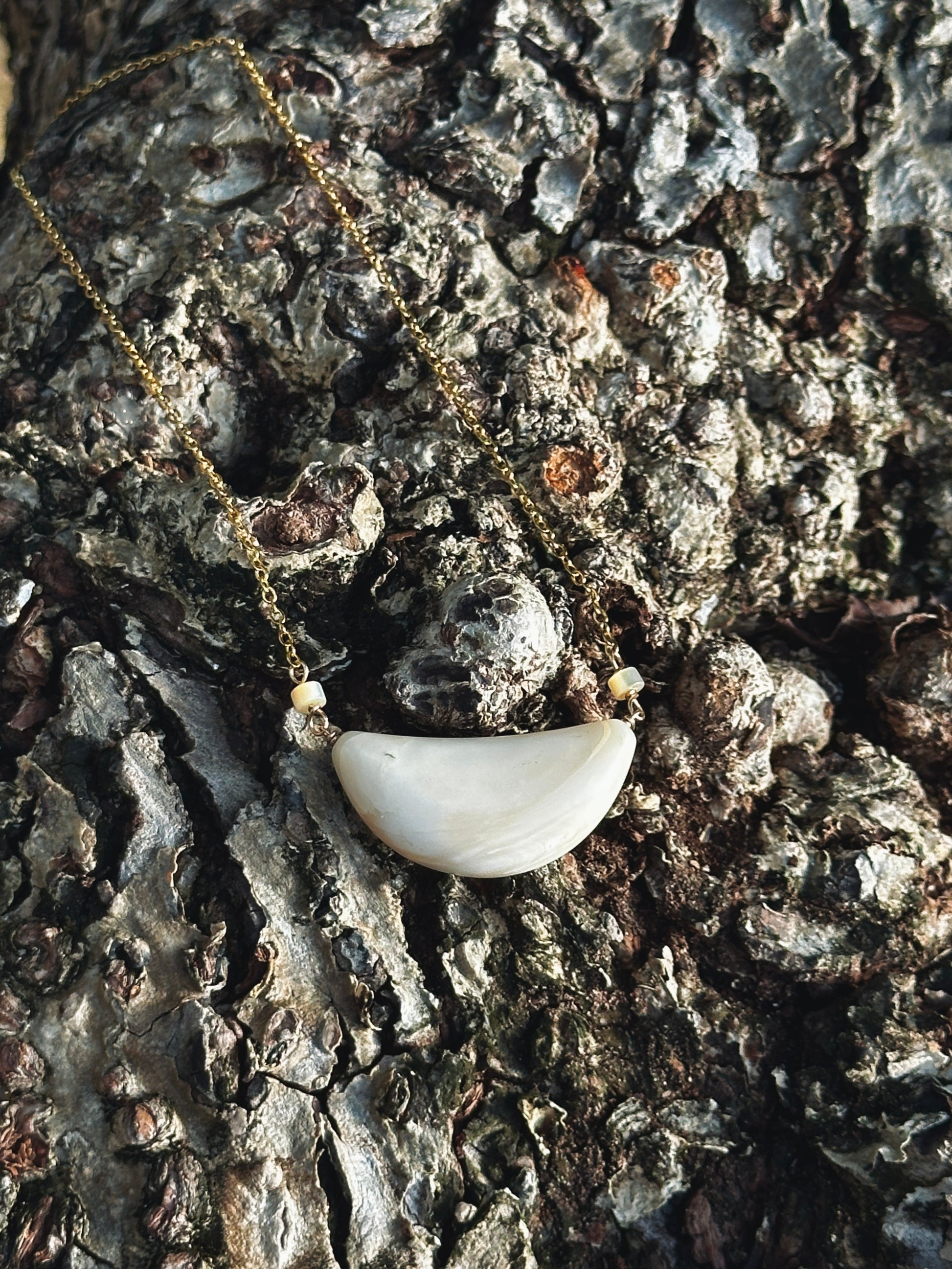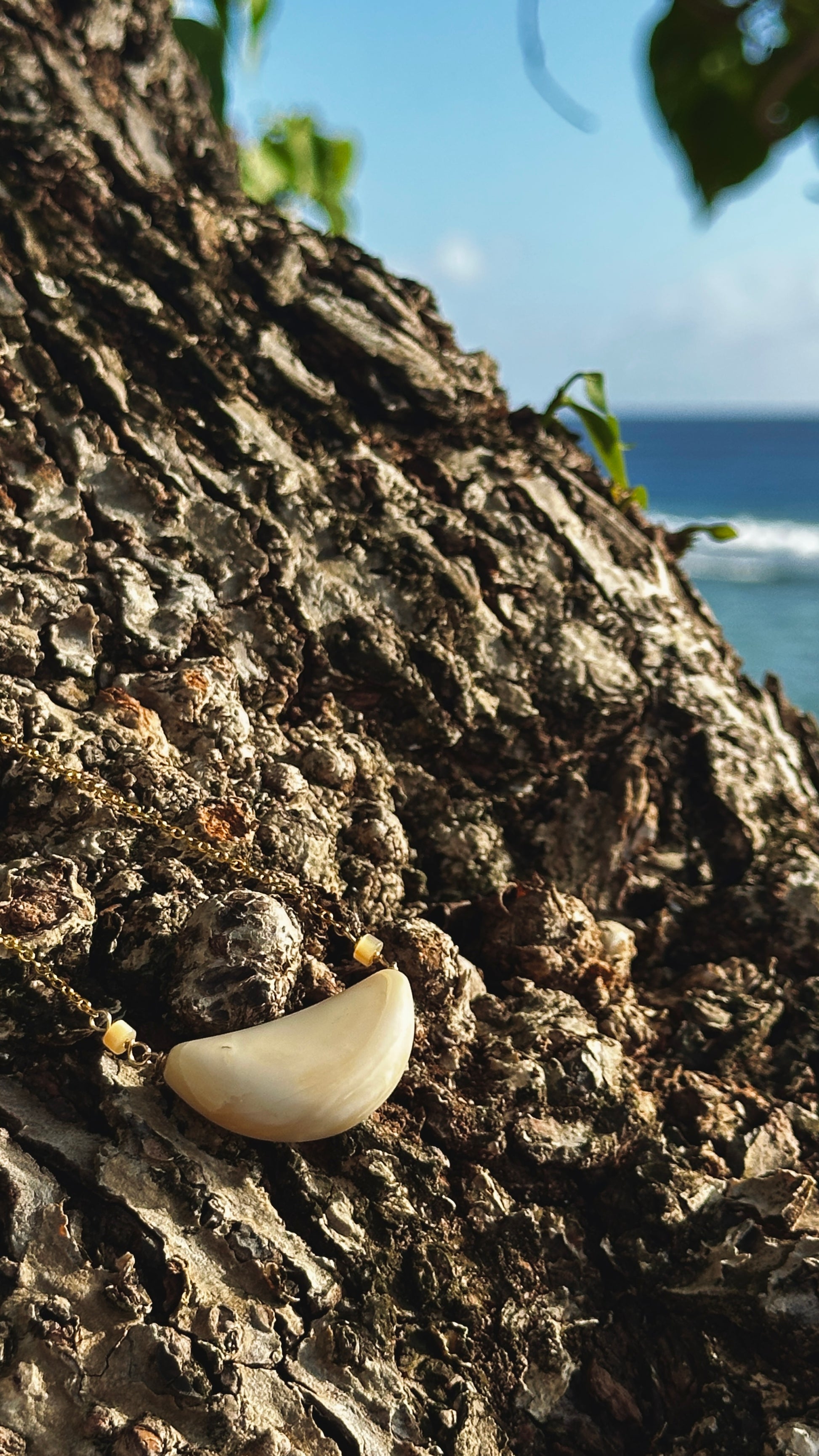 Sinåhi shaped pendant made from Mariånas clam. Comes standard on an 18k gold plated chain with mother-of-pearl side beads.