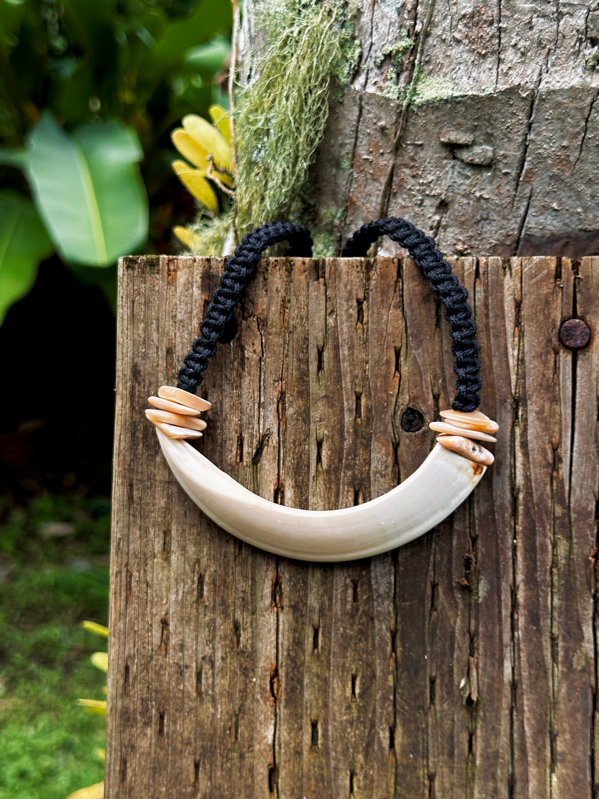 Boar tusk pendant with MOP shard side beads on braided black cord.