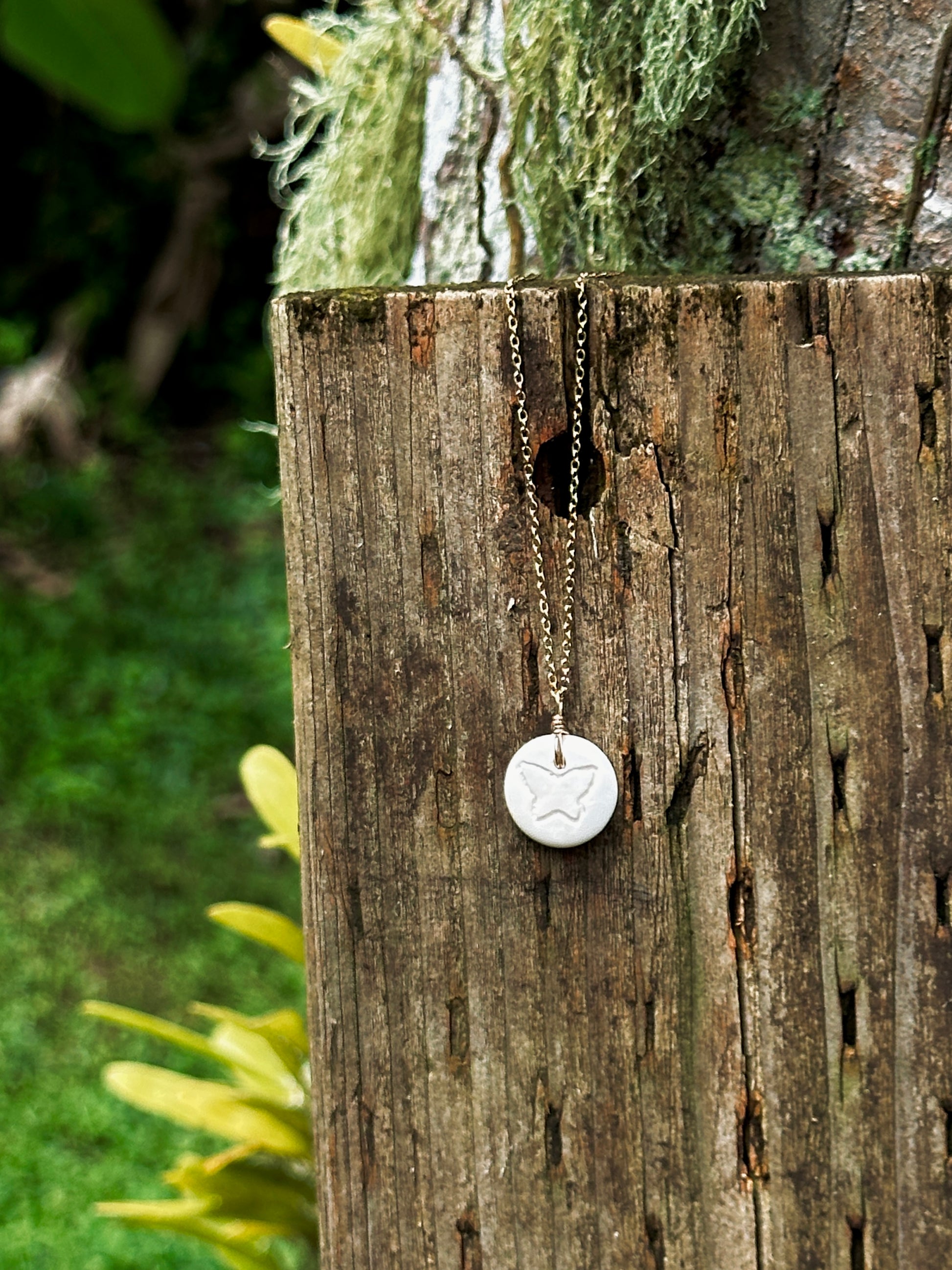 Money bead pendant with a butterfly shaped engraving made from Mariånas hima on an 18k gold plated chain.