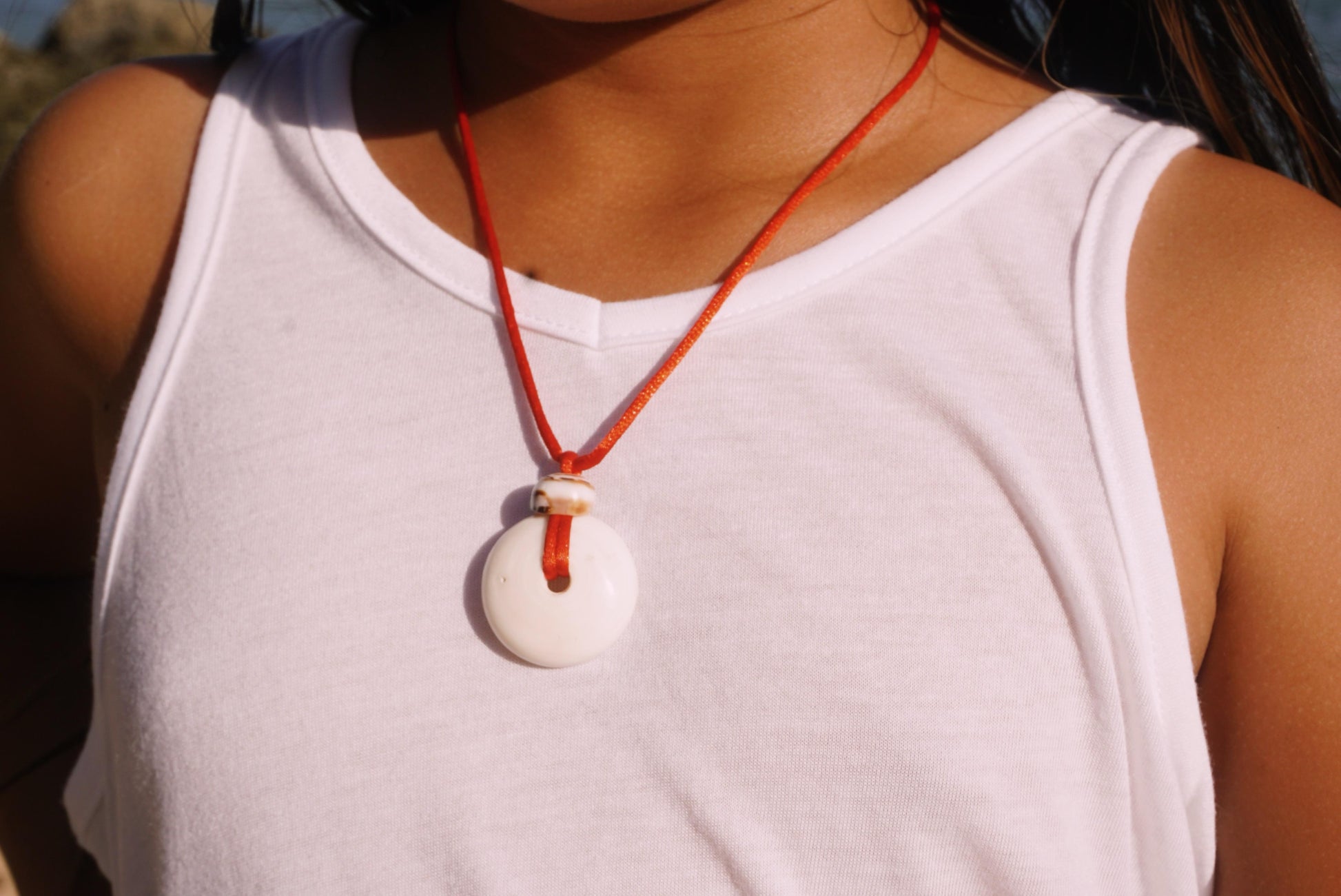 Large puka shell with a Hebrew Coneshell top bead on a fully adjustable red cord.