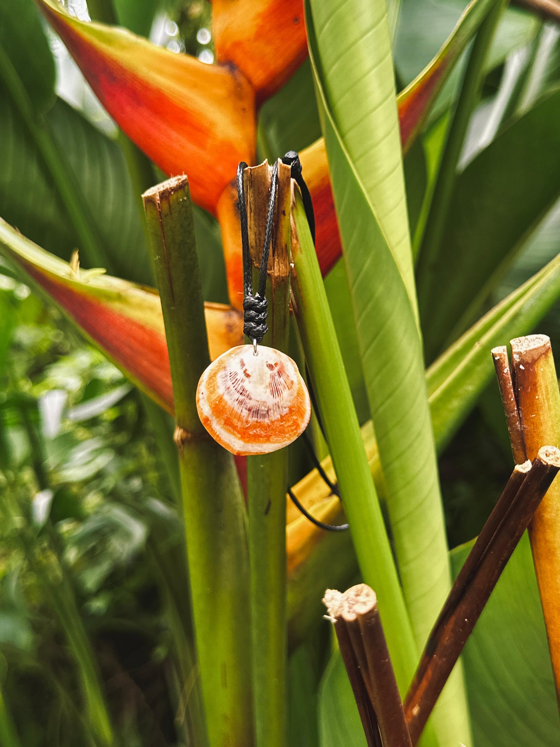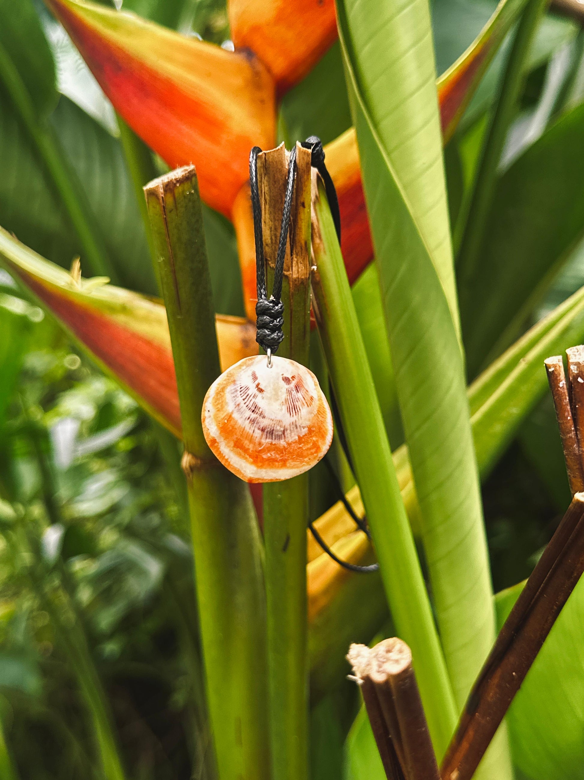 Naturally shaped Mariånas spondy pendant. Comes standard on an adjustable black cord.