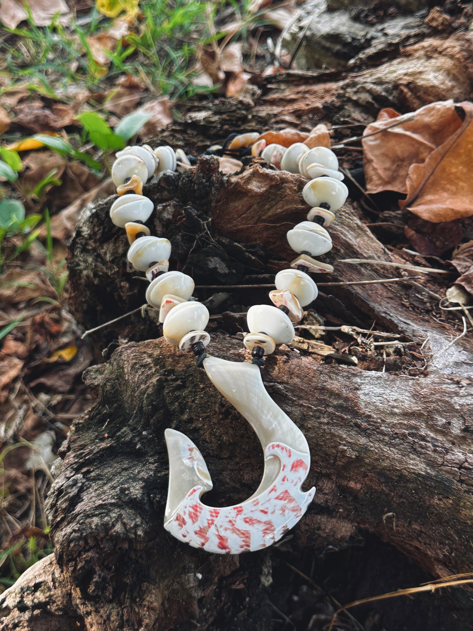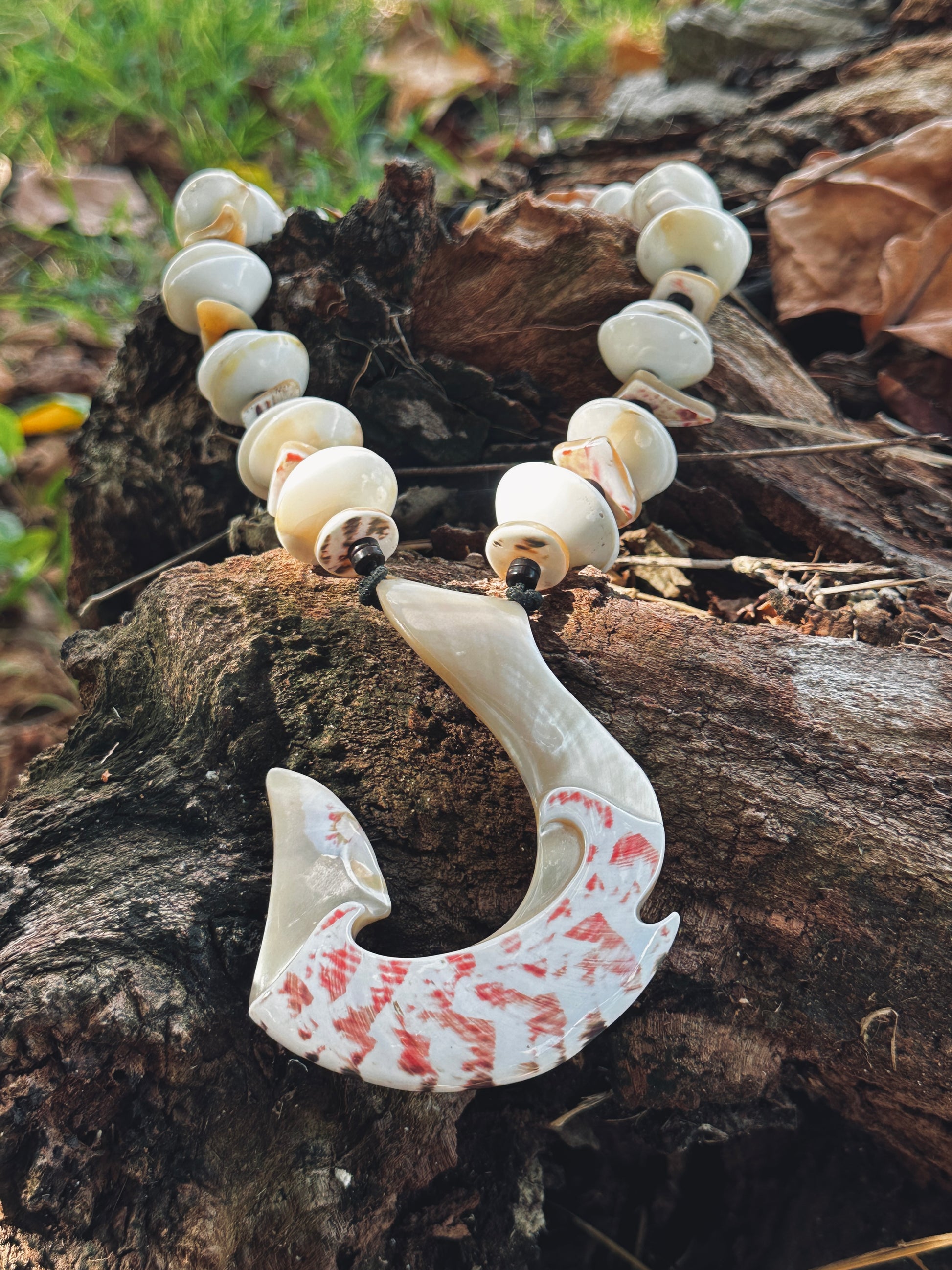 Large hook pendant with a double wave carved into it. The pendant is complemented by a mixture of operculum and black coconut side beads as well as aliling shards. Comes standard on the rugged m95 paracord.