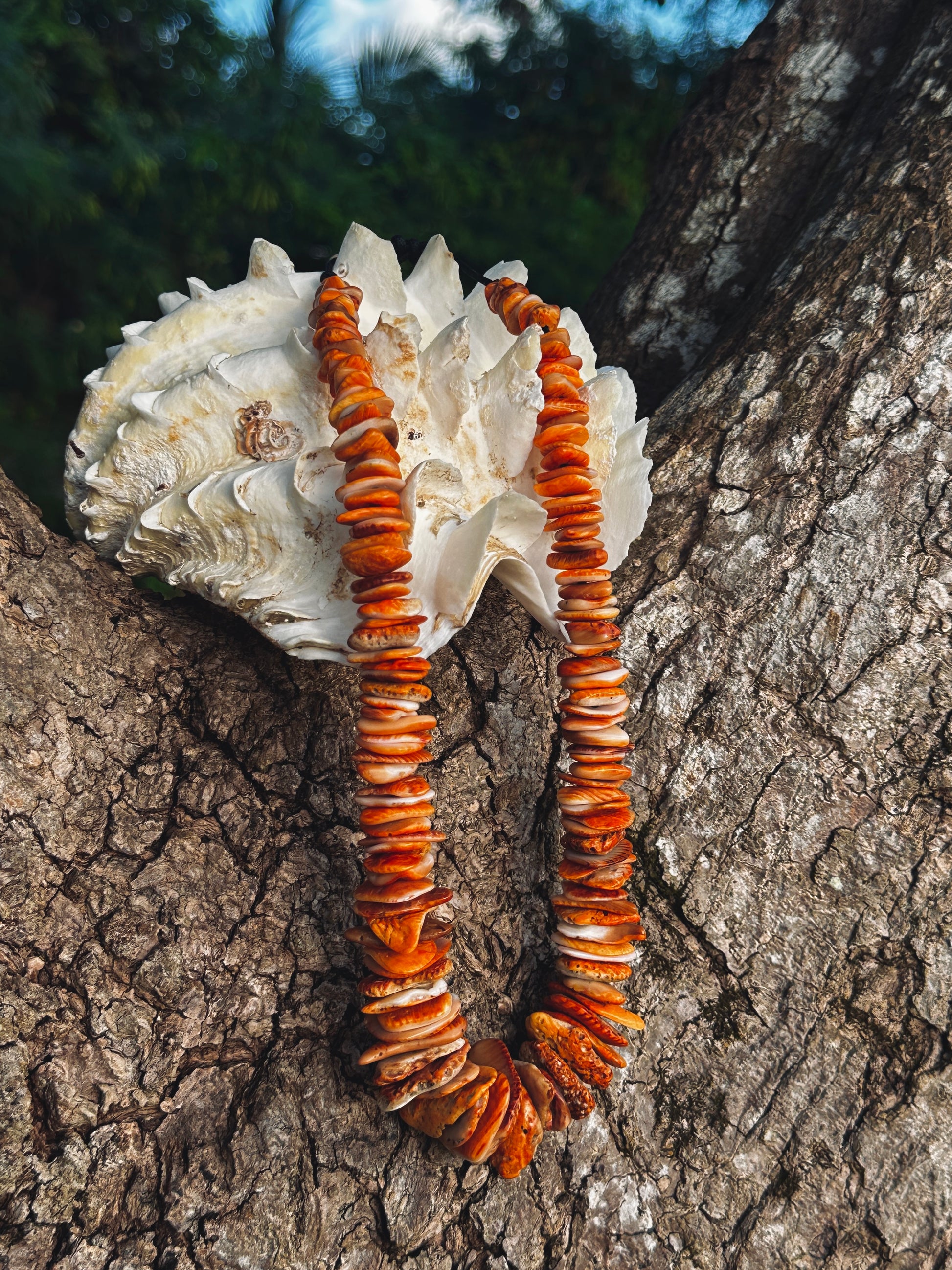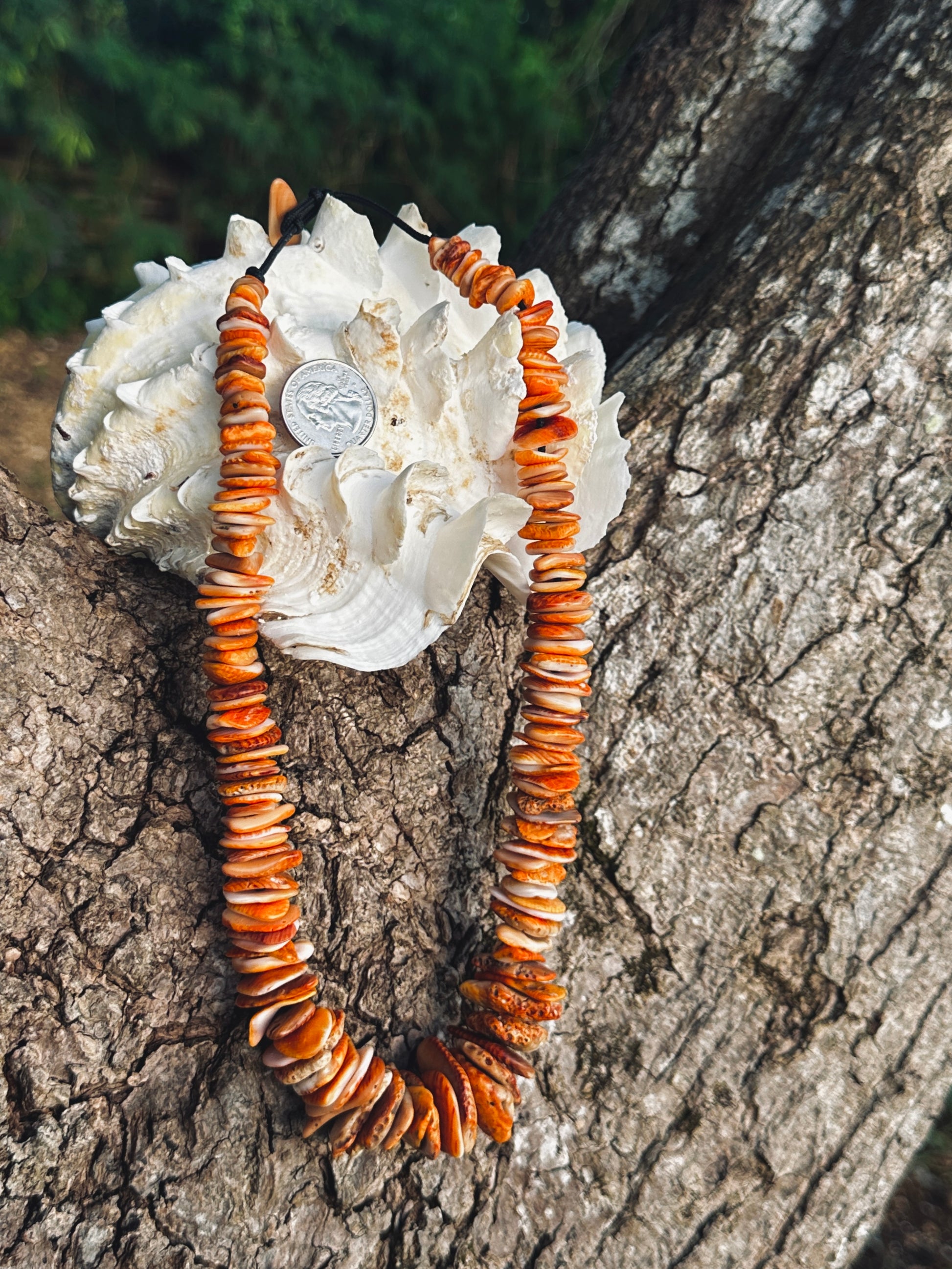Necklace made from Mariånas spondy shards. Polished, hand drilled and graduated from largest pieces at the middle to smallest pieces at the ends. Comes standard on the extremely rugged M95 paracord. Extra insurance included with purchase.